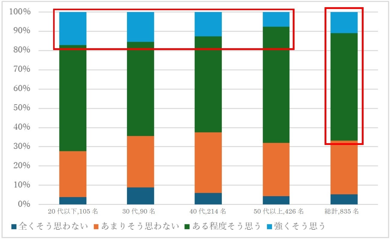 ・性別を超えたファッションであると強く思う割合は若年層になるほど割合が高い