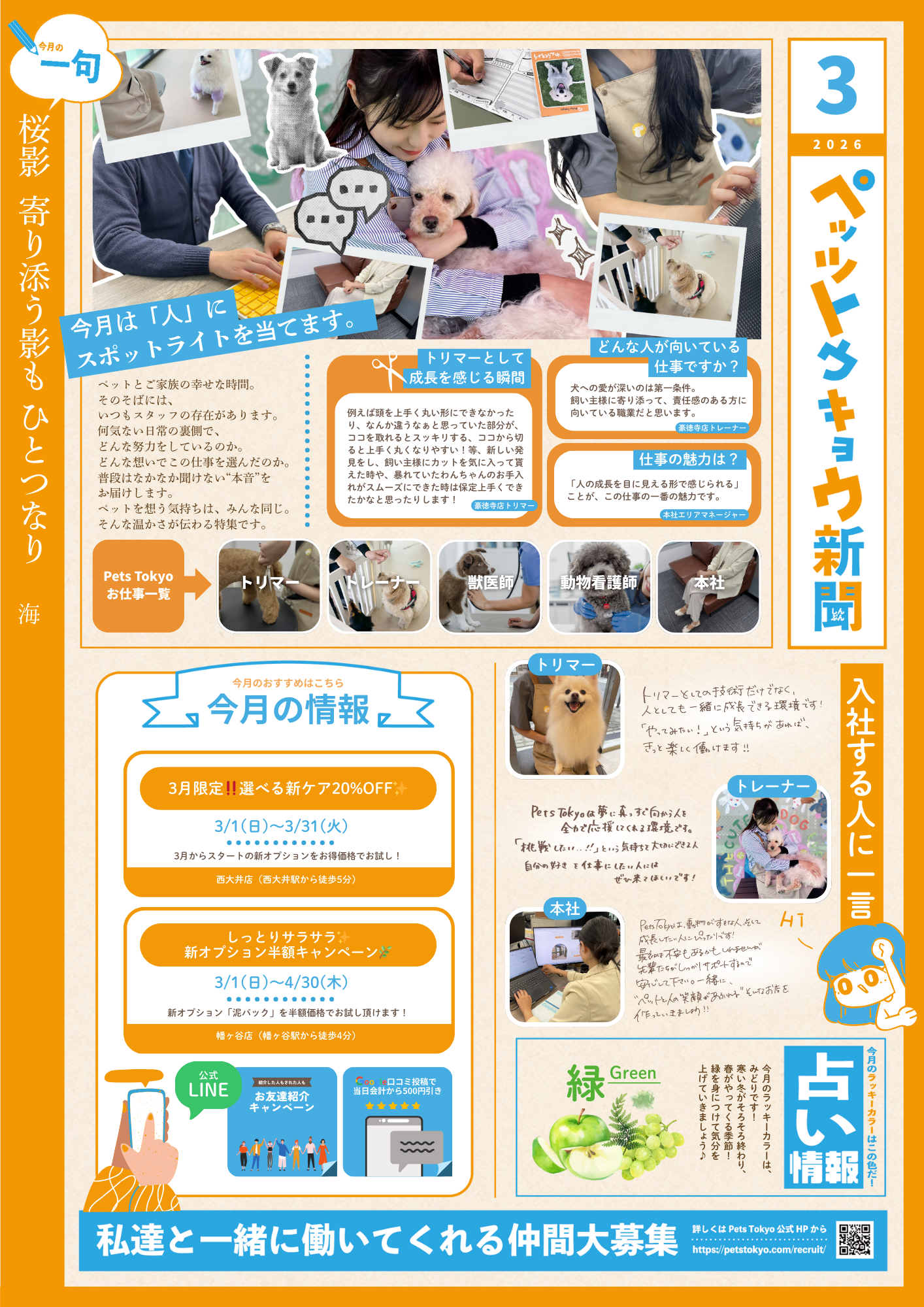 「ペッツトウキョウ新聞」は、ペットとの暮らしをより楽しく、より快適に過ごすためのヒントをお届けする月刊情報誌です。3月号では、Pets Tokyo株式会社の店舗にて実際に働いているトリマー、トレーナーのインタビュー記事を掲載しております。