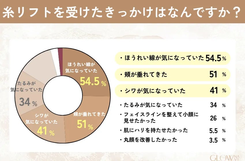 きっかけとして多いのは「ほうれい線が気になっていたから」、「頬が垂れてきたから」、「シワが気になっていたから」などでした。