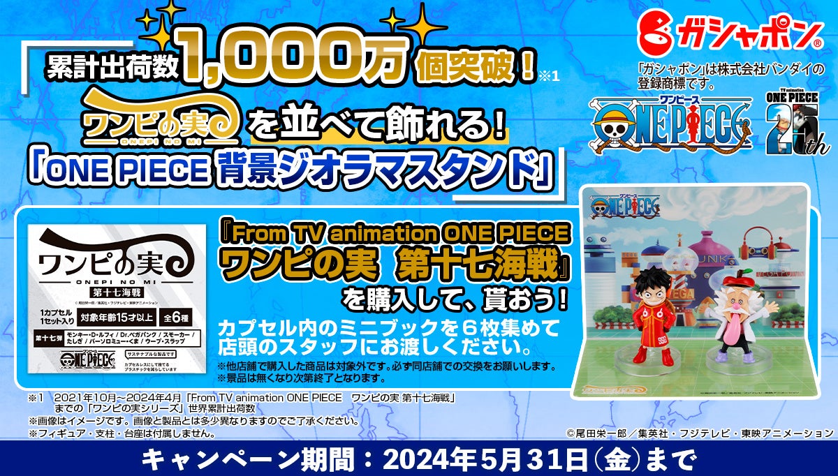 これを記念して、「From TV animation ONE PIECE ワンピの実 第十七海戦」を6つ購入すると対象の店頭で「ONE PIECE 背景ジオラマスタンド」(全1種)が一枚もらえるキャンペーンを実施します。