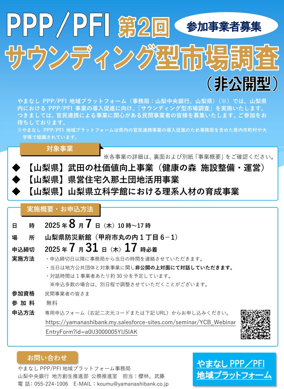 やまなしPPP/PFI地域プラットフォーム(事務局:山梨中央銀行、山梨県)は、地方公共団体におけるPPP/PFI事業の推進と、民間事業者さまの事業参画を支援するため、第2回「PPP/PFIサウンディング型市場調査(非公開)」を実施いたします。
