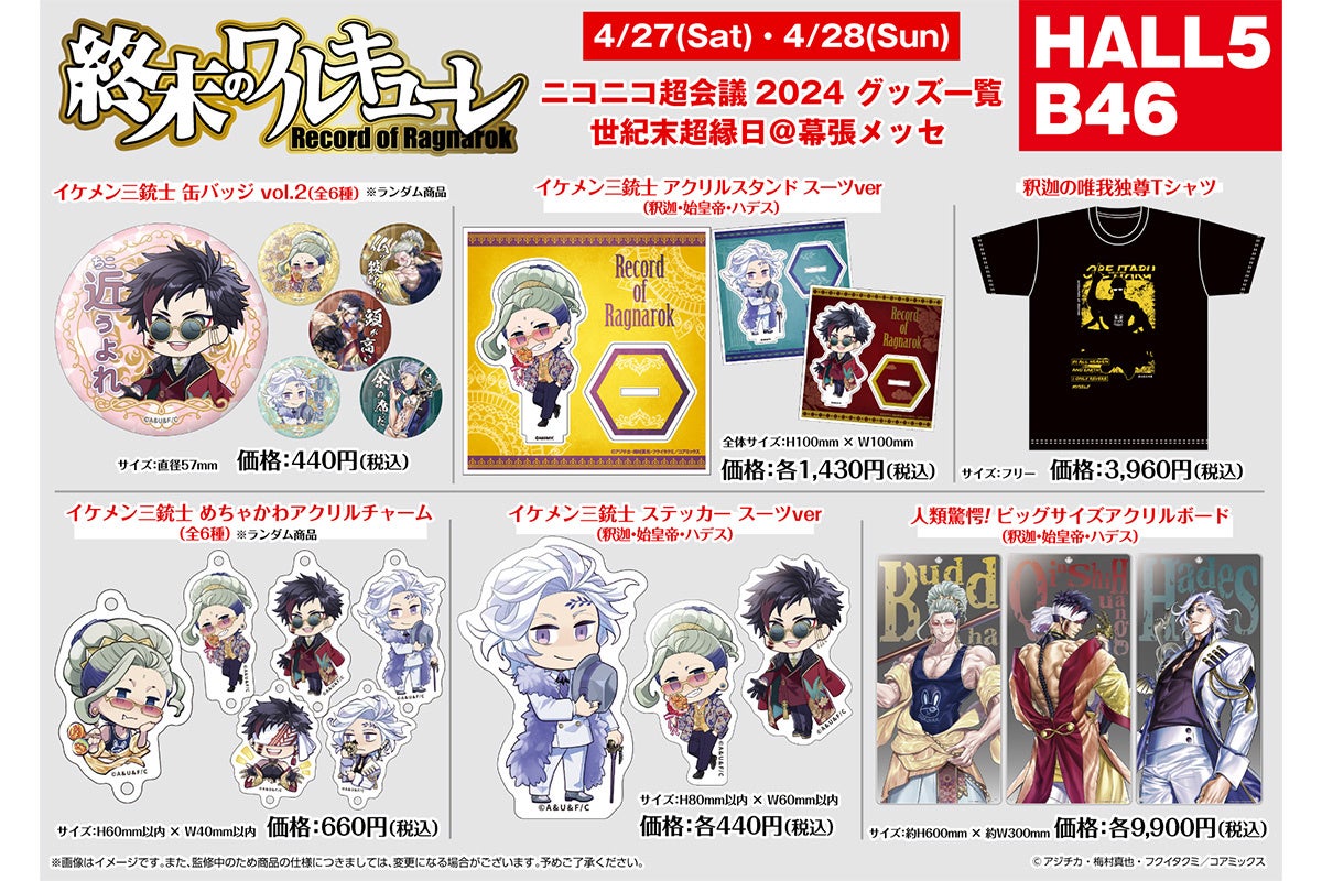 『終末のワルキューレ』は昨年発売し、今もなお大好評の“イケメン三銃士 缶バッジ” の第2弾や長さが60センチある“ビッグサイズアクリルボード”、デザイン性豊かな“釈迦のTシャツ”などが新たにラインナップに加わった。