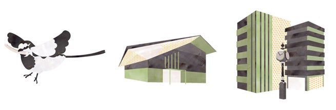 今回のリニューアルでは、未来屋書店と女子美術大学による共同研究により、店舗内装を共同開発。板橋区の鳥ハクセキレイが板橋区の街を巡り、最後は象徴的なランドマークである区立中央図書館内にある「いたばしボローニャ絵本館」に至るデザインを企画・制作しました。