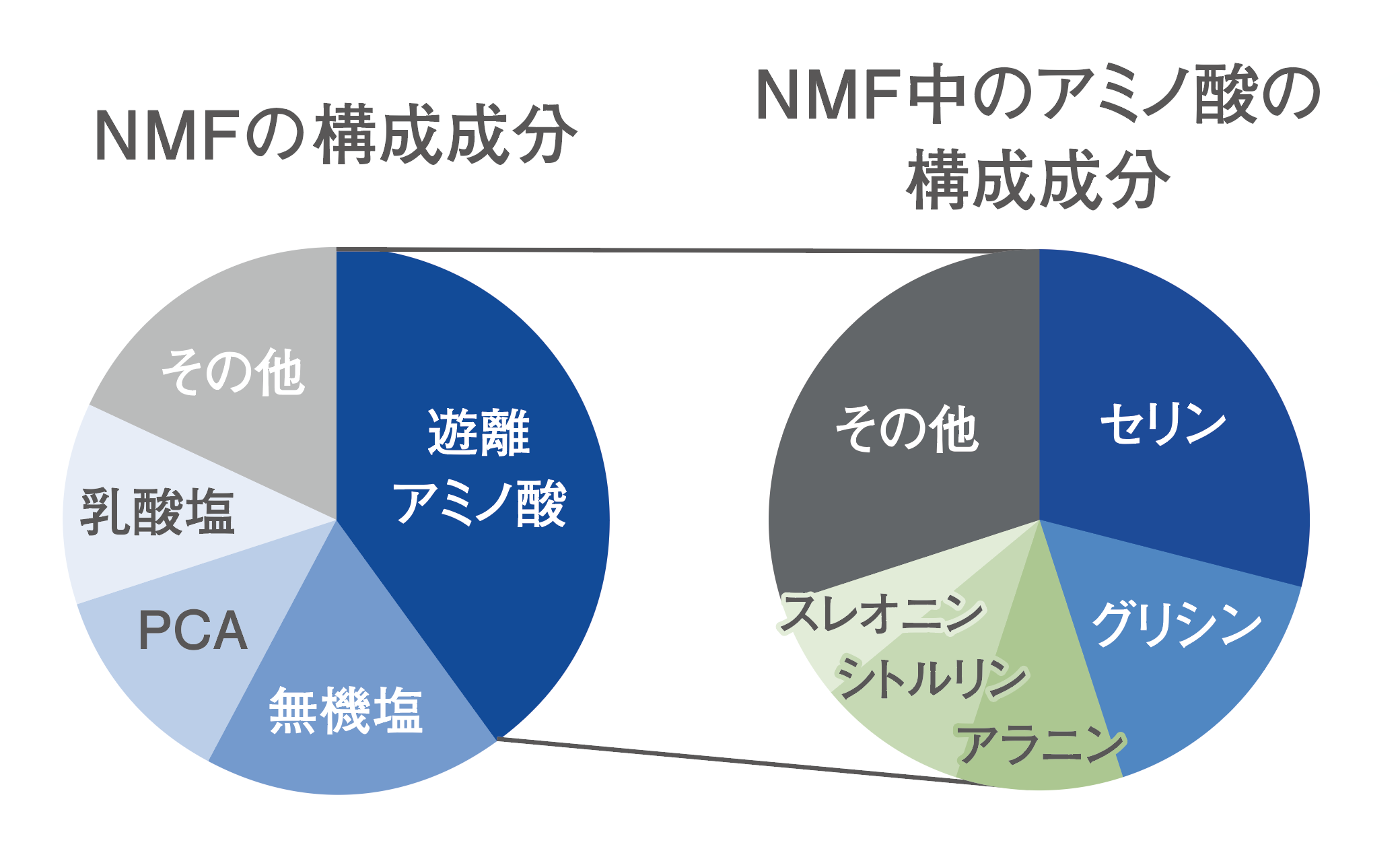 NMFは角層中の水分を引き寄せて蓄えることで、角層をうるおすはたらきがあります。NMFのうち最も多くを占めているのが遊離アミノ酸。中でもセリン・グリシンの含有量が多くなっています。