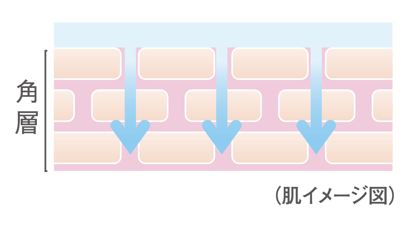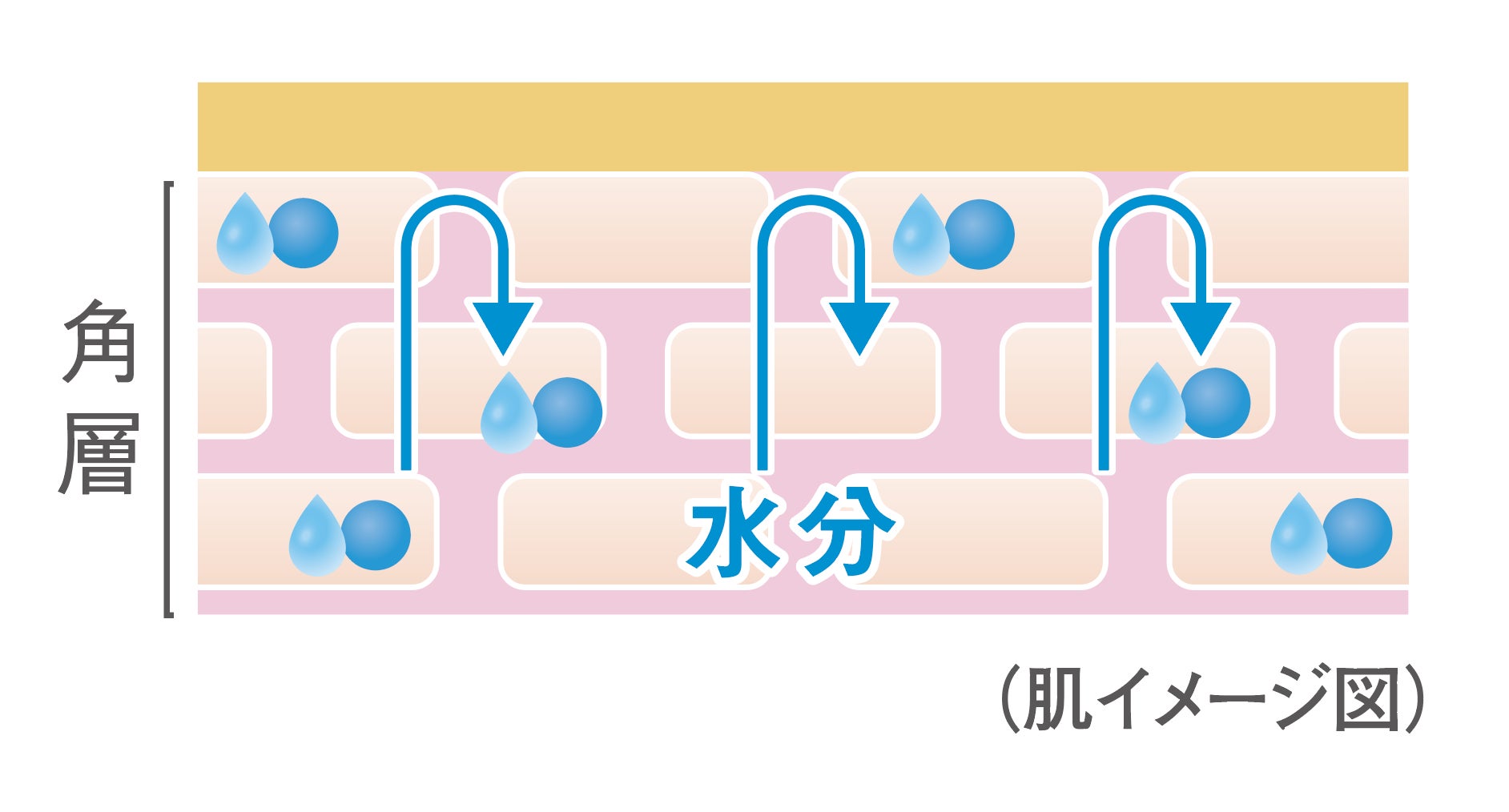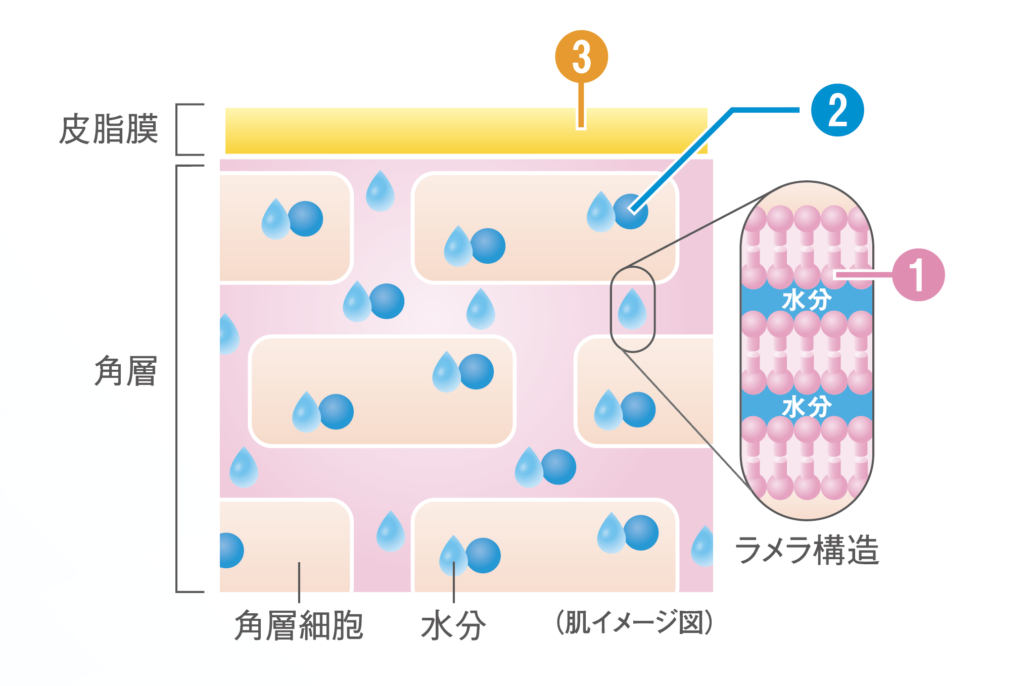 皮脂は角層の表面に皮脂膜を作り、皮膚からの水分蒸発を防ぐはたらきがあります。スクワランやワセリンが皮脂をサポートし、お肌からの水分蒸発を防いでうるおいを保ちます。