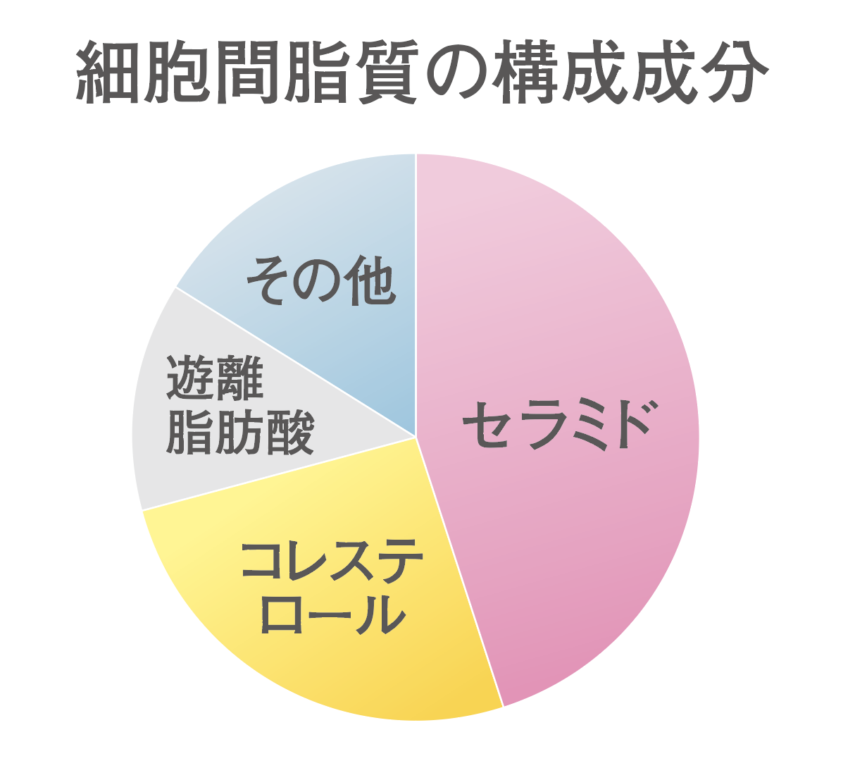 細胞間脂質の主な構成成分はセラミド、コレステロール、遊離脂肪酸。角層内の隙間を埋め、水分を保持するはたらきがあります。