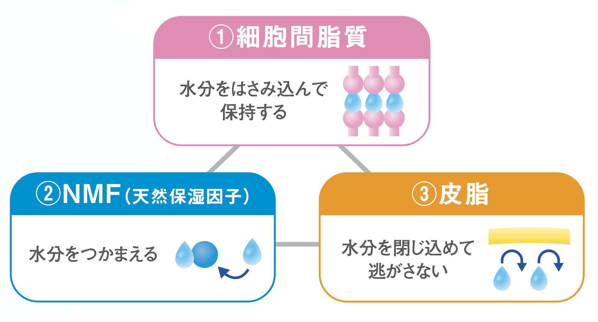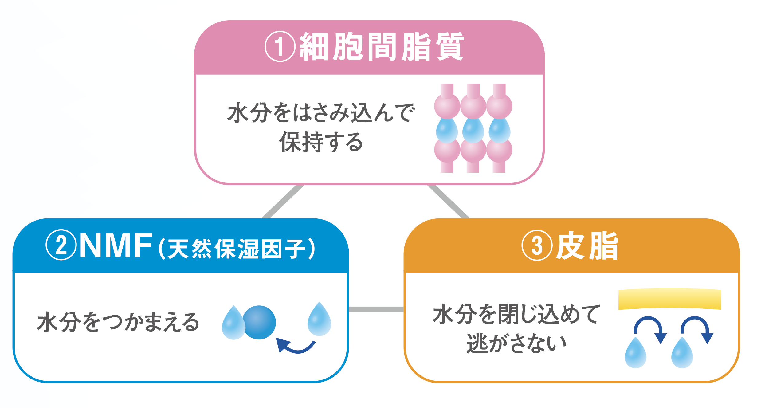この3つの因子のバランスが乱れるとお肌は乾燥し、さまざまな刺激に反応して肌トラブルが起こりやすくなるため、3つの因子のバランスを保つことが大切です。
