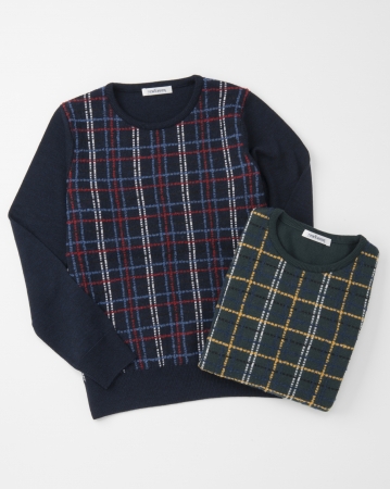 ニューヨーカーオリジナルのチェック柄で、ブロッキングされたデザイン。ブークレー糸でふっくらと仕上げた、柔らかな素材感。オンオフどちらのシーンでも使えるデザインニットプルオーバー。(価格:¥19,000+税 / カラ―:ボトルグリーン、ネイビー / 素材:毛55%アクリル25%ナイロン20%)