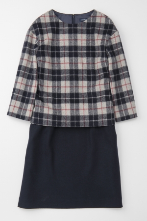 一着でコーディネートが完成してしまう、トラッドなチェック柄の接結ワンピース。上身部分はトレンド感のある、シャギー加工仕上げ。使用しているチェックはニューヨーカーオリジナルのハウスタータンを贅沢に使用。スカートは圧縮したメルトン風加工の素材で、上品なイメージに。(価格:¥28,000+税 / カラ―:ボトルグリーン、ネイビー 素材:毛89%ナイロン11%別布部分:毛100%)http://www.ny-onlinestore.com/item/51443264/?utm_source=newssite&utm_medium=pr