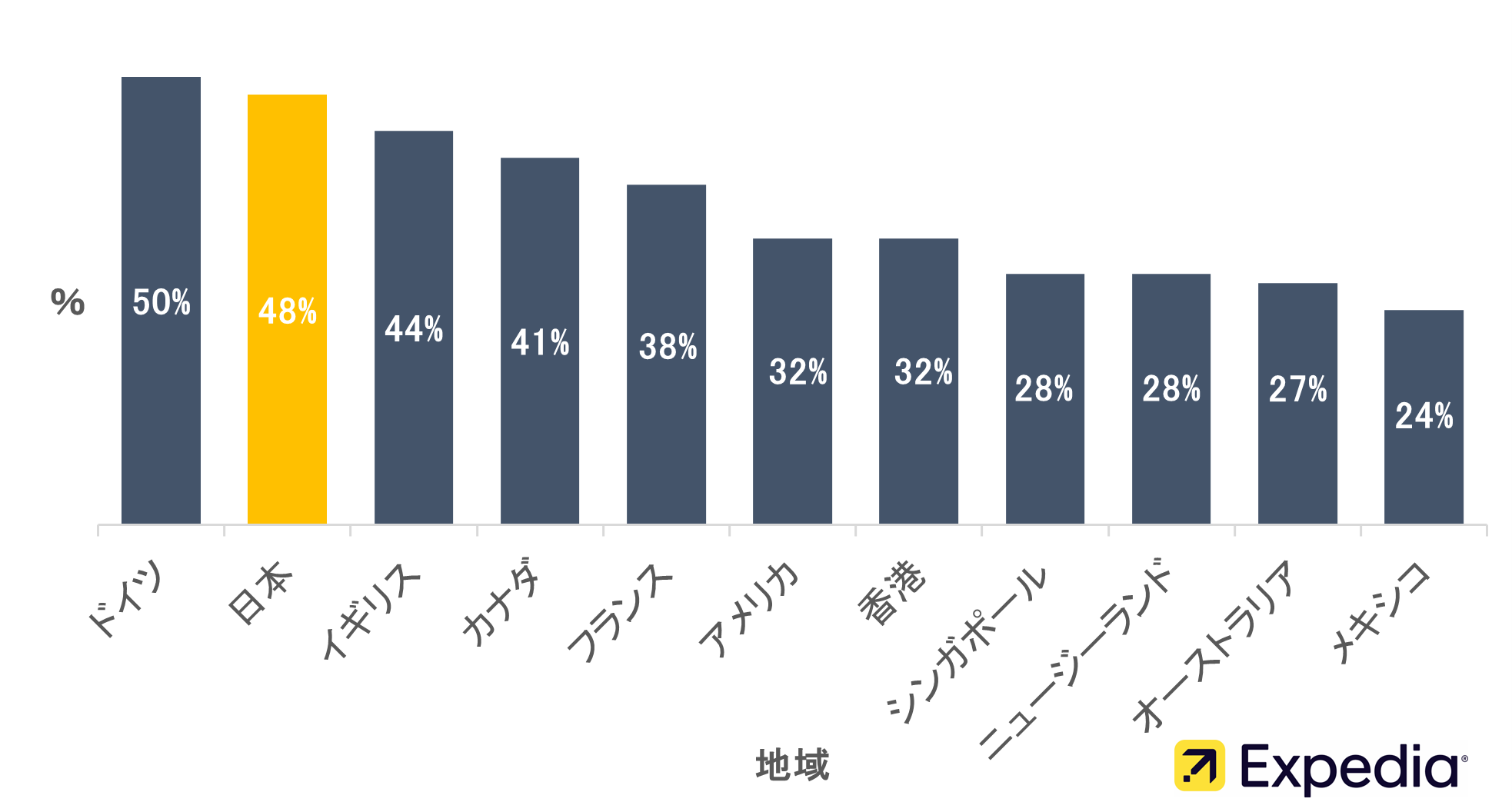 ステイホームする人が多いという結果の一方で、日本で働く人の37%が2023年の旅行を「すでに予約済み」と回答。内訳としては20%が国内旅行、10%が海外旅行、7%が国内海外両方を予定している結果となりました。また、今年最も楽しみにしている旅行について、半数近くが「夏休み中の旅行(48%)」と回答、これは世界で2番目に多い割合でした。