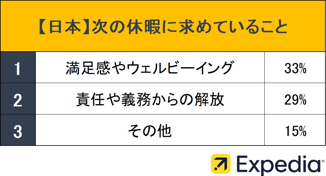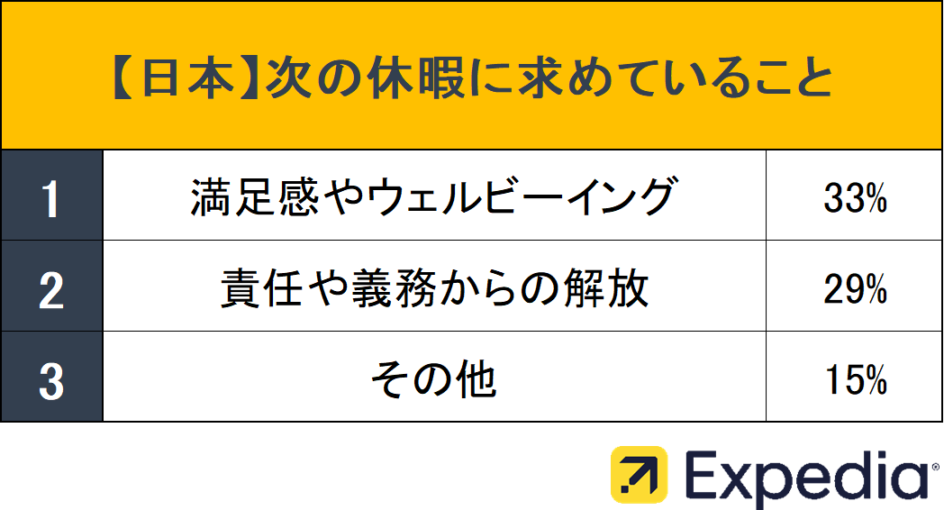 また、「次の休暇で求めていること」について、最も多かった回答は「満足感やウェルビーイング(33%)」でした。休暇を取り、心身ともにリフレッシュすることで、仕事へのパワーを養っていきたいのかもしれません。