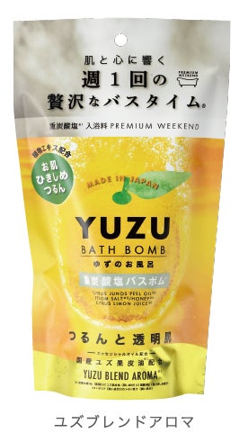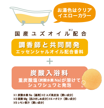 国産ユズオイル※2を配合した「ゆずのお風呂」は、お湯に入れると重炭酸塩※1が溶けてシュワシュワと発泡するタイプ。