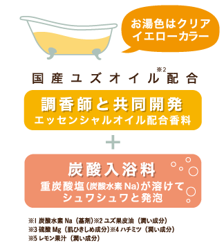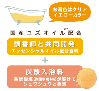 調香師と共同開発した国産ユズオイル※2を配合した香り豊かなバスボムで、ゆったりしたバスタイムをお楽しみいただけます。
