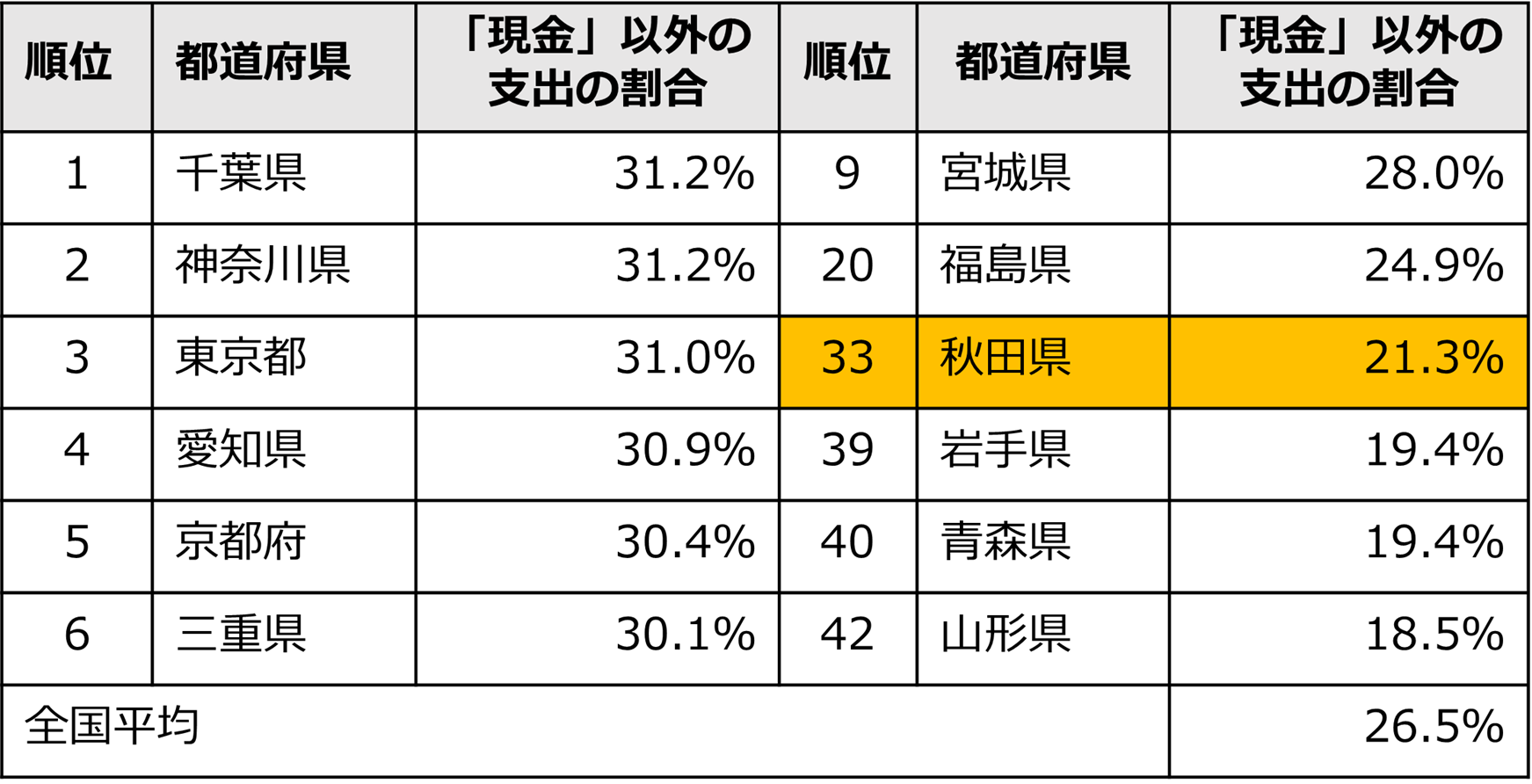 <都道府県別での「現金」以外の支出の割合>