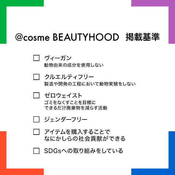 2022年4月にローンチした「@cosme BEAUTYHOOD」。コンテンツ投稿やライブ配信等のエシカルな美容情報をインスタグラムにて発信しています。@cosme BEAUTYHOODでは、6つの掲載基準(ヴィーガン、クルエルティフリー、ジェンダーフリー、ゼロウェイスト、社会貢献、SDGsへの取り組み)を設け、そのうち2つ以上該当するブランドのみを紹介しています。エシカルな美容の知識の認知拡大を目指しつつ、生活者の新しい美容へのアティテュードを形成していきます。