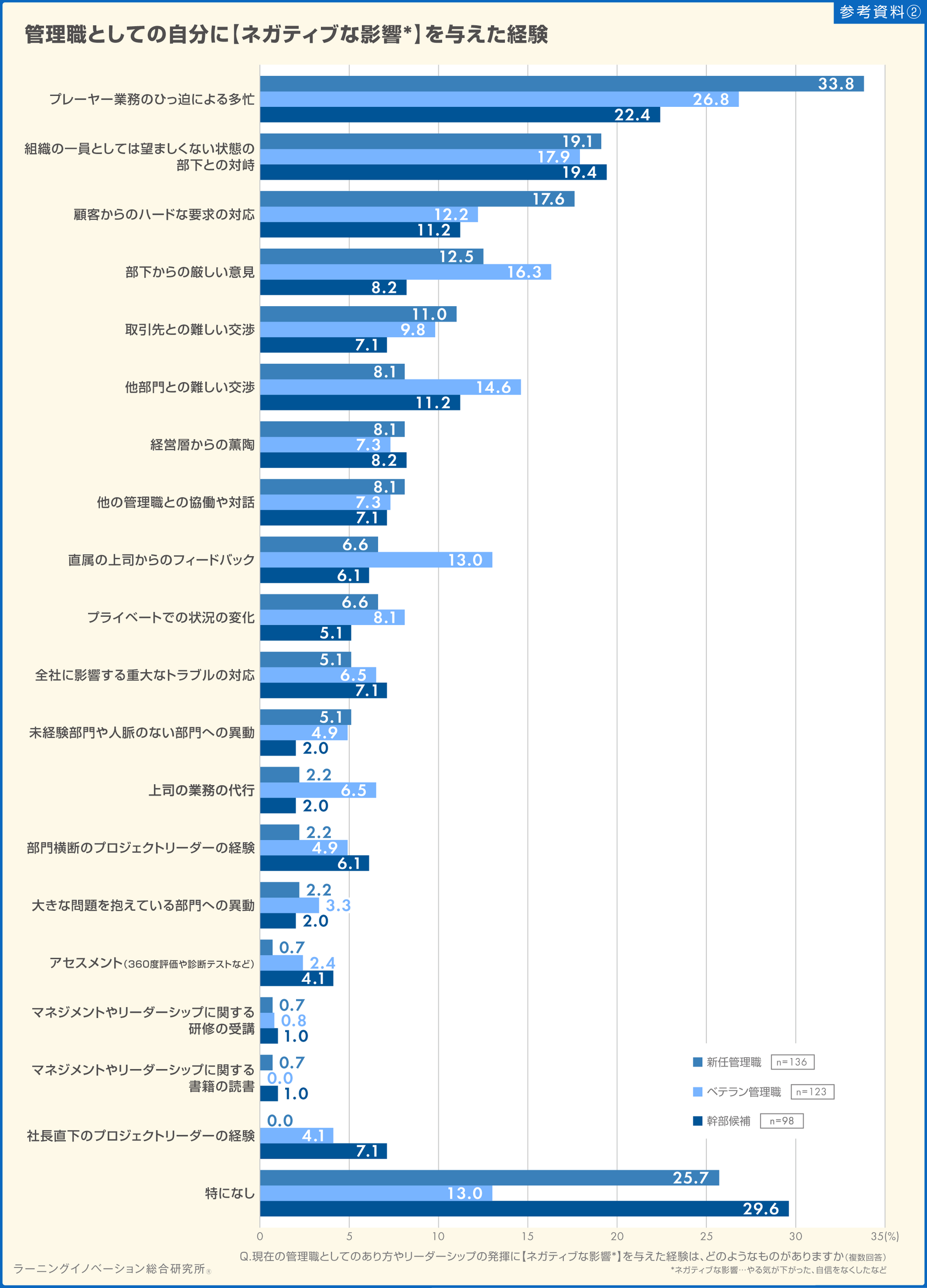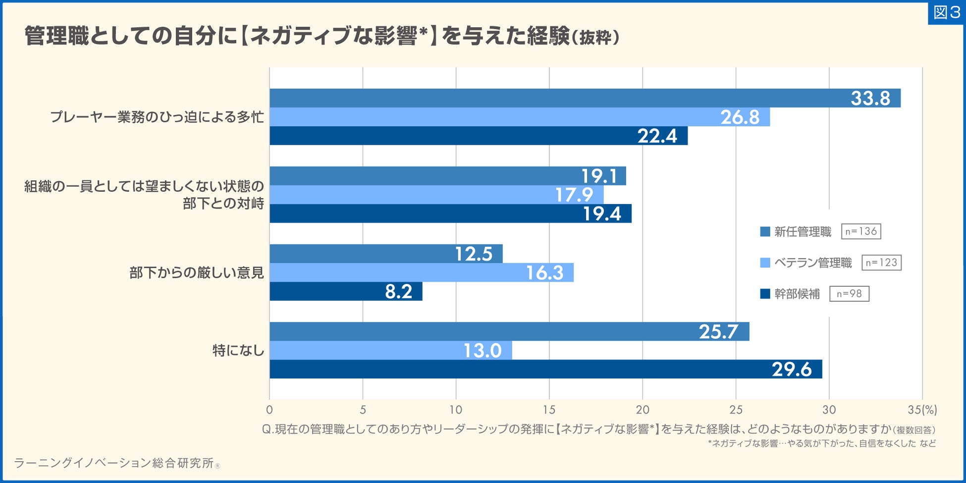 リーダーシップの発揮に【ネガティブな影響】を与えた経験、新任・ベテランは「プレーヤー業務のひっ迫による多忙」、幹部候補は「特になし」がそれぞれトップ(図3)