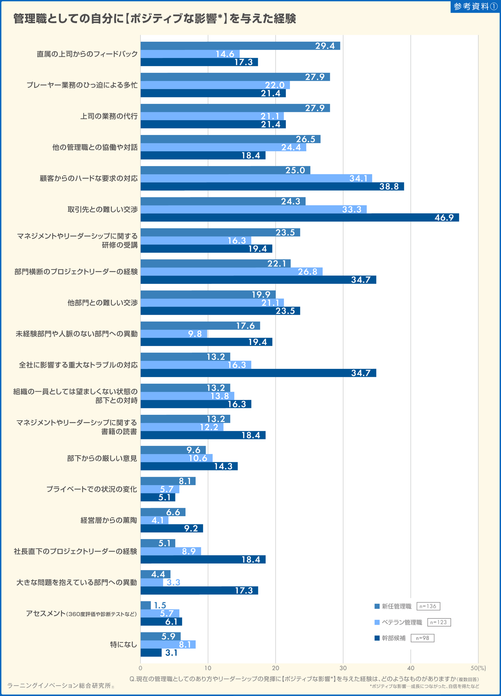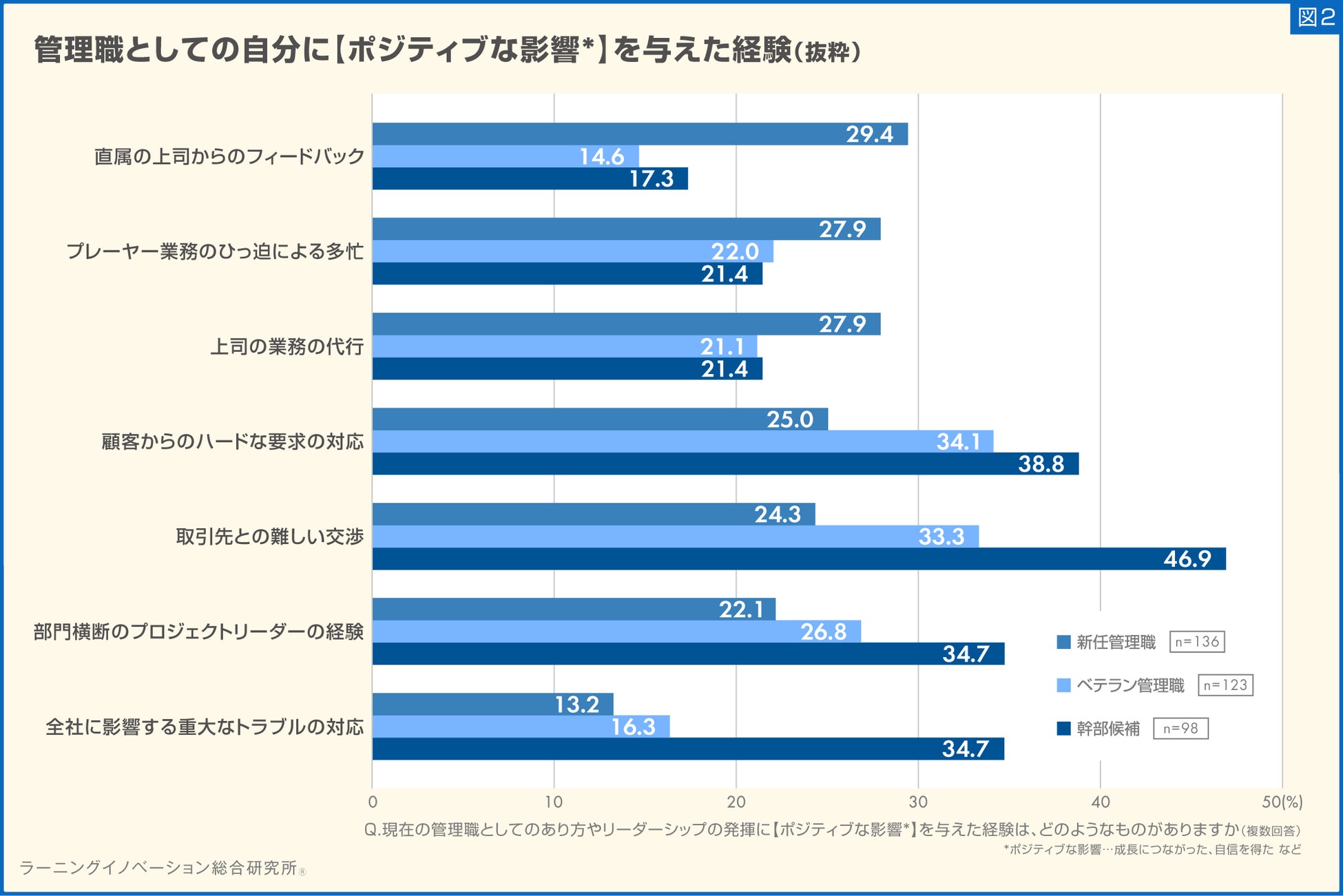 リーダーシップの発揮に【ポジティブな影響】を与えた経験、新任は「上司からのフィードバック」、ベテランは「顧客からのハードな要求の対応」、幹部候補は「取引先との難しい交渉」がそれぞれ1位(図2)
