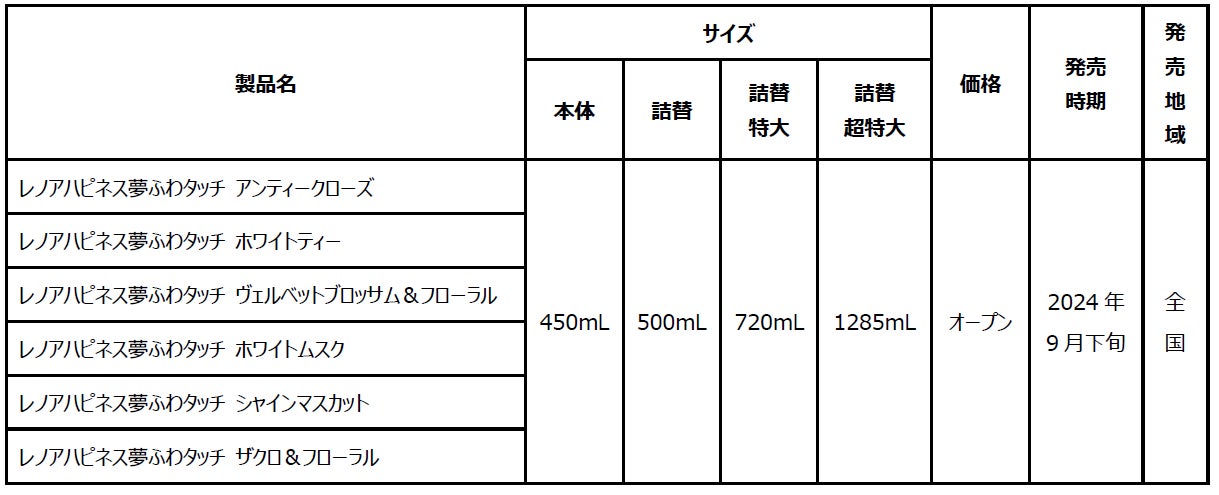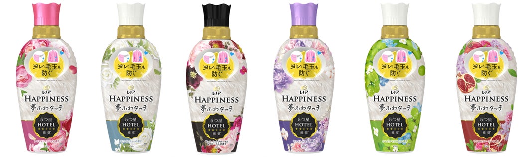 左から:「レノアハピネス夢ふわタッチ アンティークローズ」、「レノアハピネス夢ふわタッチ ホワイトティー」、「レノアハピネス夢ふわタッチ ヴェルベットブロッサム&フローラル」、「レノアハピネス夢ふわタッチ ホワイトムスク」、「レノアハピネス夢ふわタッチ シャインマスカット」、「レノアハピネス夢ふわタッチ ザクロ&フローラル」