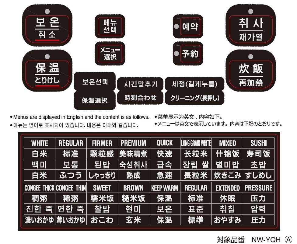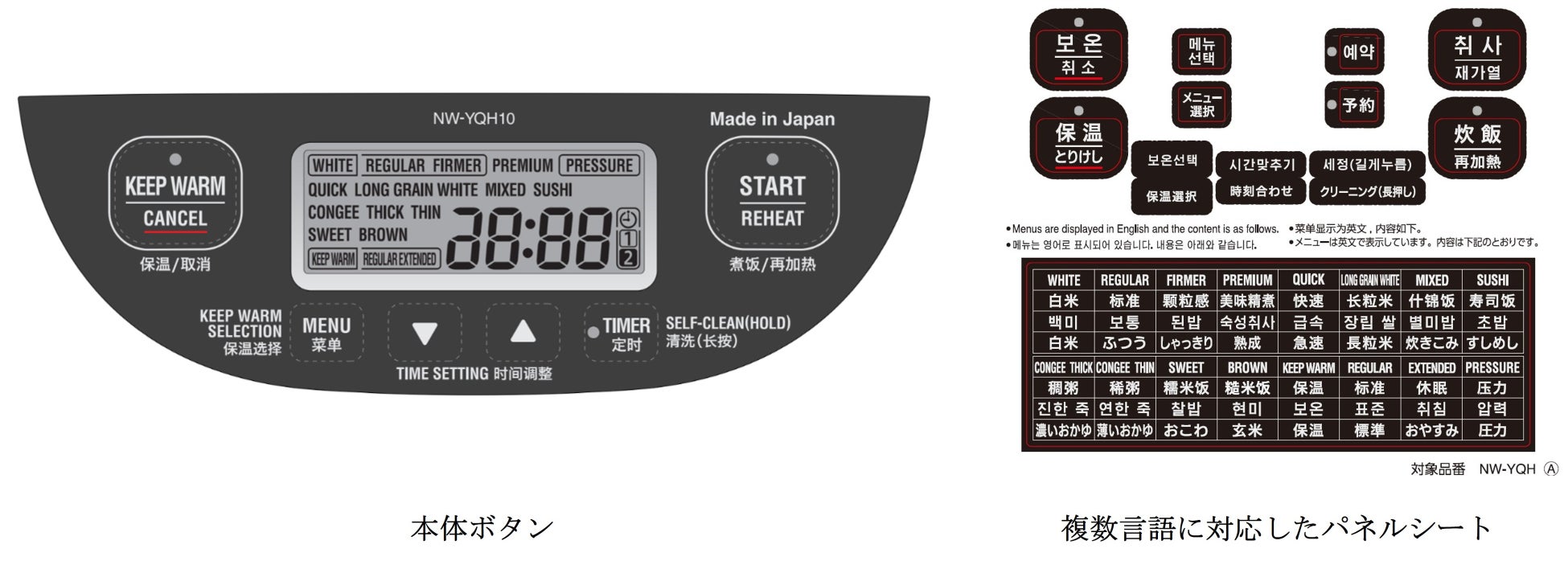 本体ボタンは英語と繁体字を併記してます。また、様々な言語に対応するため、日本語・英語・韓国語・中国語(簡体字)に対応したパネルシートも付属しています。