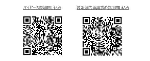 | 参加方法 | ◆バイヤーの参加申し込み https://docs.google.com/forms/d/e/1FAIpQLSepc3-Pi82PsE7rWn4dRvMdnDjAWCL9eTDDvoVTDcfObFxkkA/viewform ◆愛媛県内事業者(メーカー)の参加申し込み https://docs.google.com/forms/d/e/1FAIpQLScYikQt2QXmW8Q5s4uexJz1Nd70g9qaRTS1JU36quDCWOmFLA/viewform ※下記QRコードからもお申込みいただけます。 |