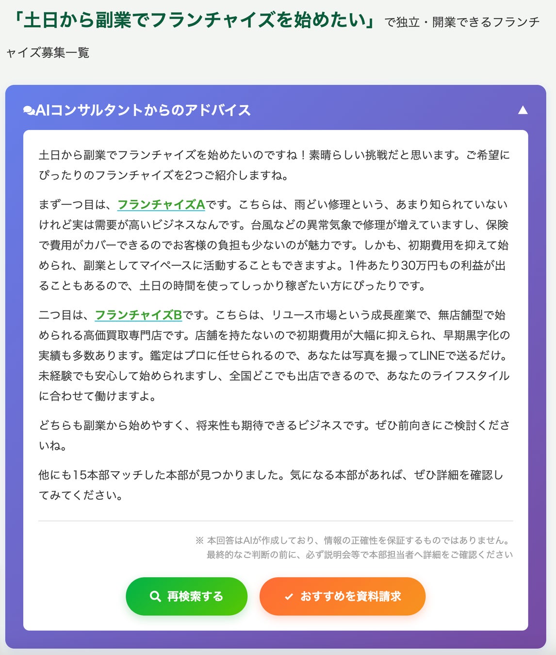 なぜそのフランチャイズ案件があなたに合っているのか、AIコンサルタントが客観的な根拠を詳しく提示します。自分では気づけなかった「相性の良さ」を言語化することで、納得感のある検討をサポートします。