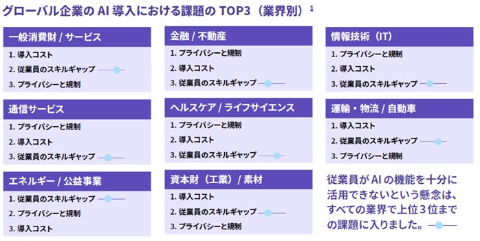 組織がAIテクノロジーを導入する際の潜在的な課題(コスト、複雑性、規制、変更管理、労働者のスキルの欠如など)の順位を調査しました。一般消費財/サービス、運輸・物流/自動車、資本財(工業)/素材などの業界では、課題の上位は「導入コスト」でしたが、従業員がAIの機能を十分に活用できないという課題は、どの業界でも上位3位までに入っています。