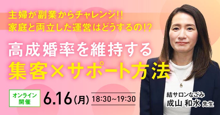 大阪で相談所運営をされている、結サロンなごみ 成山和水 先生(https://nagomi-marriage.com/) より、主婦として婚活ビジネスに副業からチャレンジしたリアルな様子と、事業として高実績を出すための集客方法とサポート方法についてお伝えいただきます。