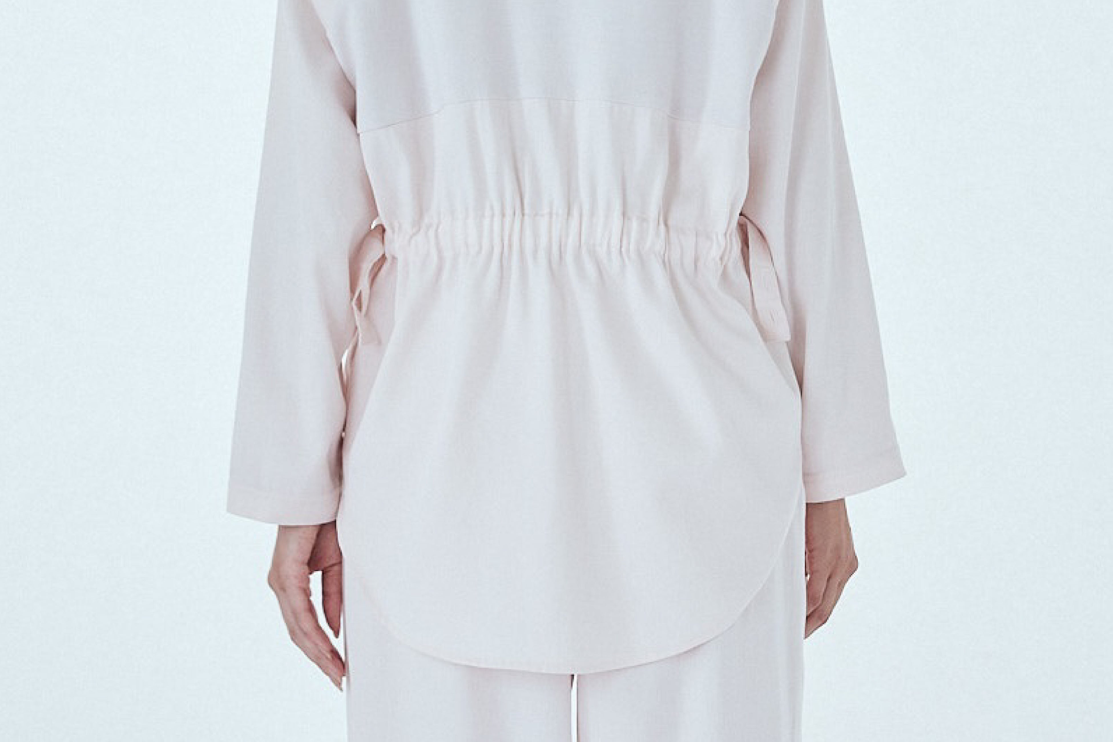 背面の腰部分にアジャスターを採用しています。アジャスターをしめて、パジャマを心地よく体にフィットさせることで、寝返り時などにパジャマがめくれ上がることを防ぎます。アジャスターは背面のみにあるので、きっちり締めても前からの見た目は変わりません。