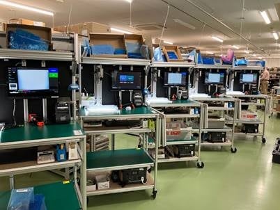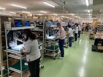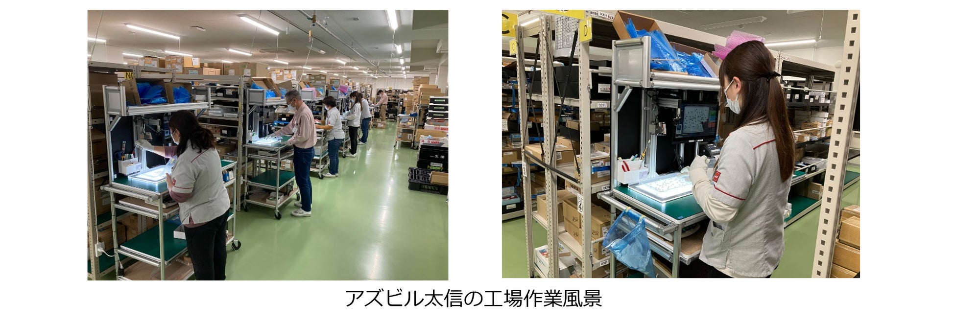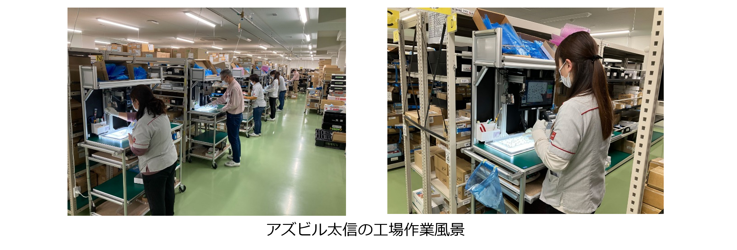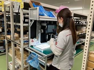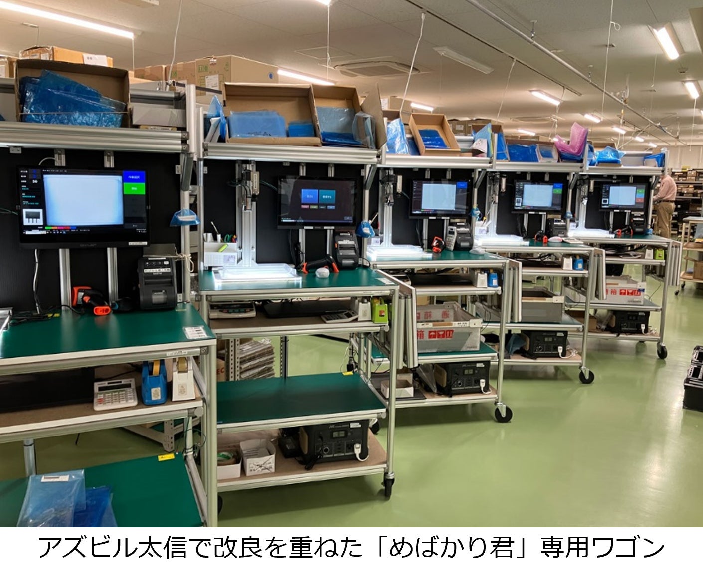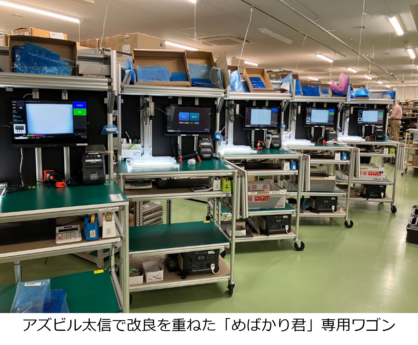 アズビル太信が導入したのは、移動が可能なモバイル版「めばかり君」です。アズビル太信では、立ったままで作業がしやすいようキャスター付きワゴンに「めばかり君」を載せ、モニター画面を作業者の目の高さに配置しました。また、LED照明を導入し、作業内容によって明るさを調節できるようにするなど、より使いやすく作業負担の少ない形に改良しています。お客様からは、「最近のソフトバージョンアップで、作業効率を向上させる機能が追加され、社内で好評を得ています。今後はログ機能を活用して、部品のカウント頻度や数を把握し、業務改善に役立てる予定です。『めばかり君』の導入により、手作業から解放され、効率的な作業環境を実現し、業務の改善が進んでいます」との声をいただいています。