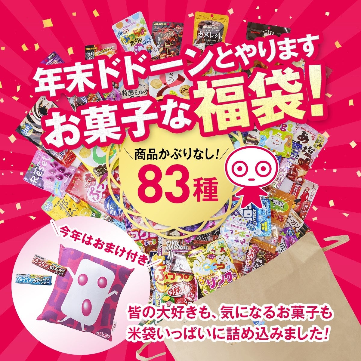 \今年の福袋はドドーンと83種類+当たり付き/ UHA味覚糖のお菓子をどっさり米袋に詰め込みました![数量限定]サプライズ福袋 2022年11月16日より販売開始