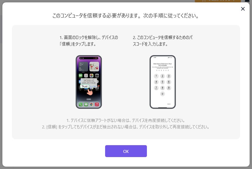 Step2、USBの接続する方法を選択し、USBケーブルでiPhoneをパソコンと接続します。iPhoneで信頼許可の画面が表示される場合、「信頼」ボタンをタップしてください。