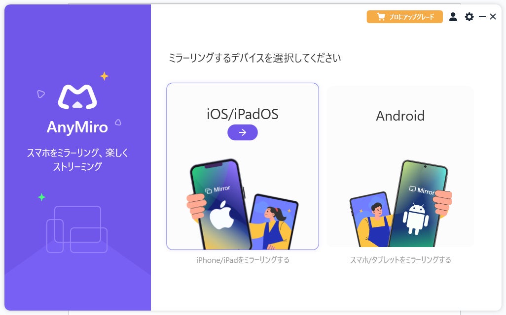 Step1、AnyMiroをPCまたはMacから起動し、デバイスを選択します。ここではiPhoneの画面をUSBケーブルでミラーリングする方法を説明します。