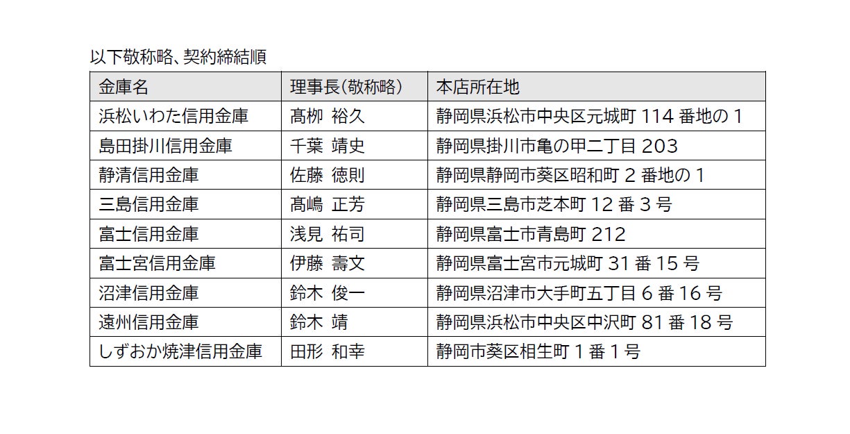 この度、日本初、静岡県内9つの信用金庫様と連携できましたことを、誠に嬉しく思います。ありがとうございます。