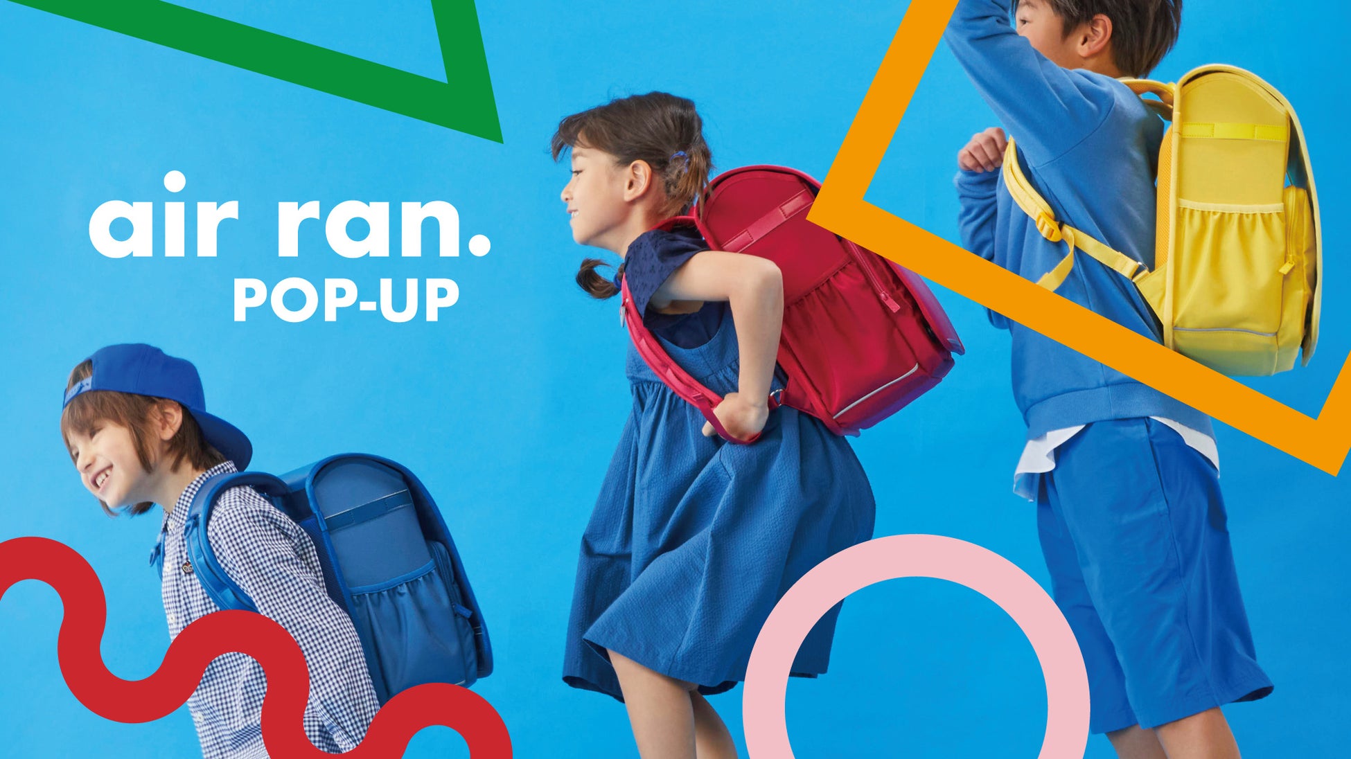全国各地でair ran. 全12色のサンプルをご覧いただけるPOP-UPを開催いたします。対象期間中、air ran. (品番:270911、270912)を購入いただいた方には、タブレットの収納など通学に便利なポーチをプレゼントいたします。