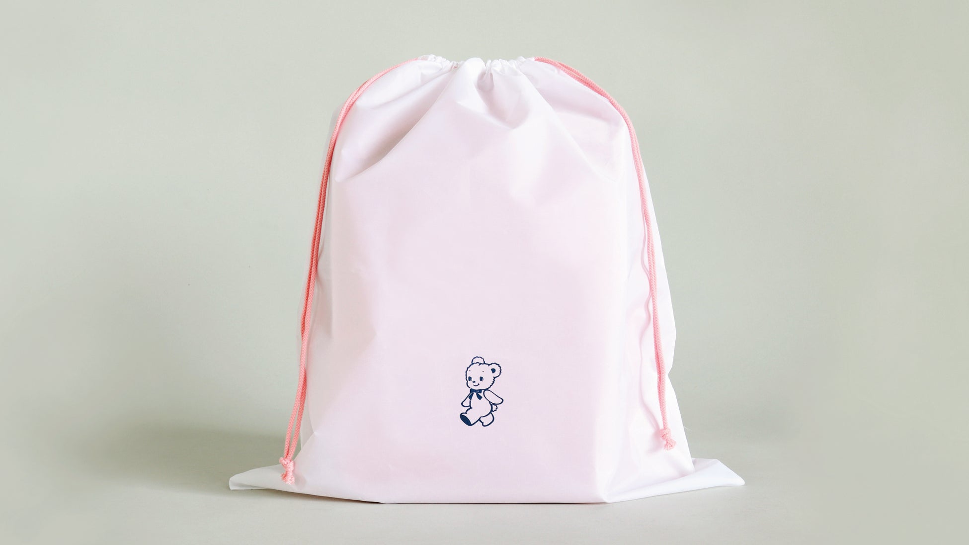air ran. (品番:270911、270912)は、クマ ちゃんのマークがついた専用のパッケージ(巾着袋)に入れてお渡しいたします。パッケージの 紐部分はair ran.の色とリンクしています。