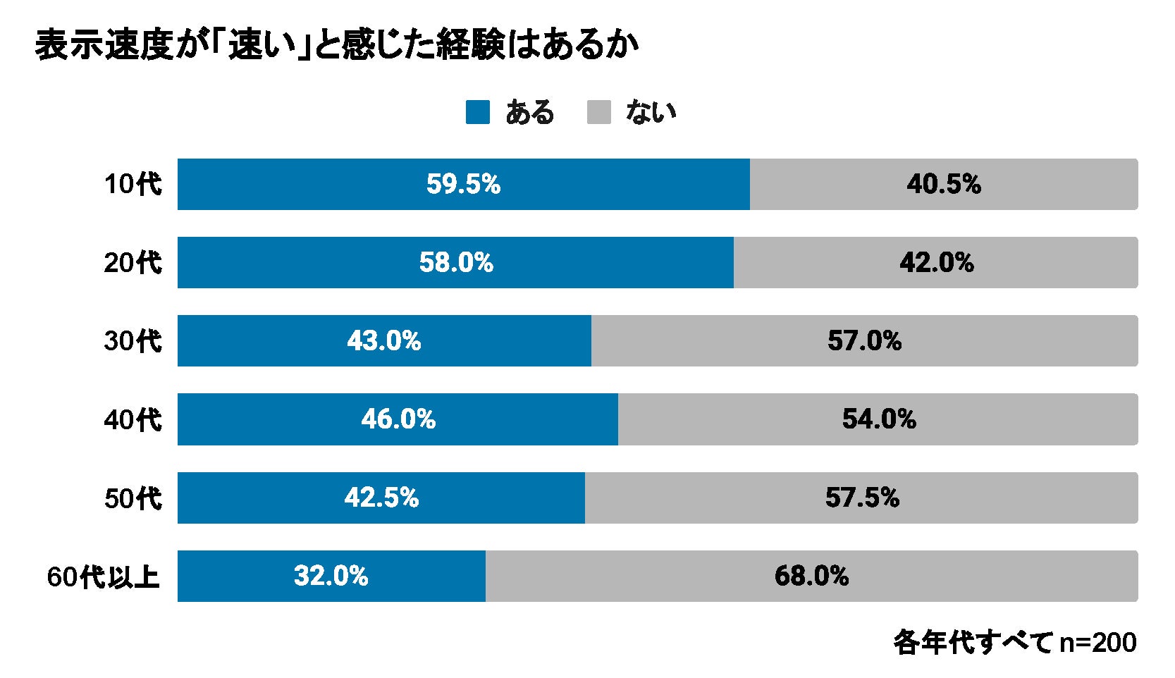 Webサイトやアプリの表示速度に対する認識の傾向を調べるため、「速い」と感じた経験と「遅い」と感じた経験の有無を質問しました。