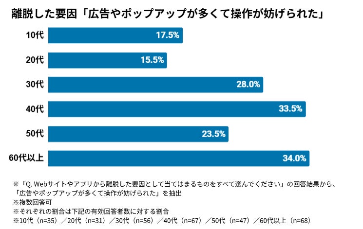 全体の25.3%が「広告やポップアップが多くて操作が妨げられた」と回答しましたが、年代別に見ると10代・20代のデジタルネイティブ世代では選択率が低いことが明らかになりました。