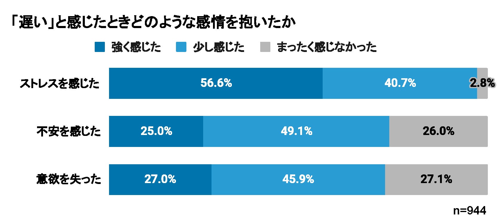 Webサイトやアプリの表示速度が遅いと感じたときの感情を尋ねた結果が次のグラフ(図3)です。「ストレスを感じた」と回答した人は全体の97.3%。Webサイトの表示速度の遅さはユーザーのストレスに直結していることがわかります。