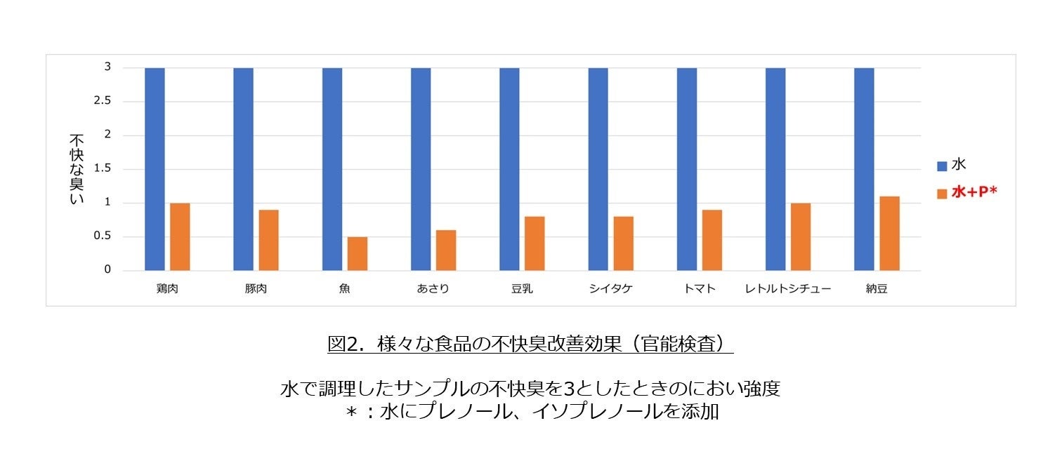 プレノールおよびイソプレノールは、大豆ミートなどの植物性たんぱく特有のにおい、肉類の不快臭(脂臭さ、畜肉臭、グラス臭)、魚介類の不快臭、納豆臭、キノコ類の不快臭、野菜の青臭い香り、レトルト臭を低減する効果を持つことが確認されました。