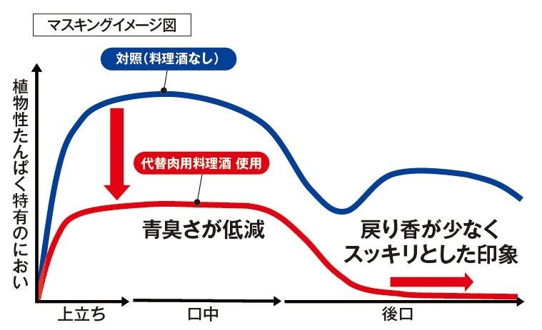 当社ではこの課題に着目して研究を行い、当社のオリジナル清酒酵母が生成する成分に、大豆ミート特有のにおいへのマスキング効果があることを発見し、2023年6月に業務用料理酒「白鶴 料理酒 CS-4T」を発売しました。また、様々な食品の不快臭を低減し、風味を向上する効果があることを明らかにしました。