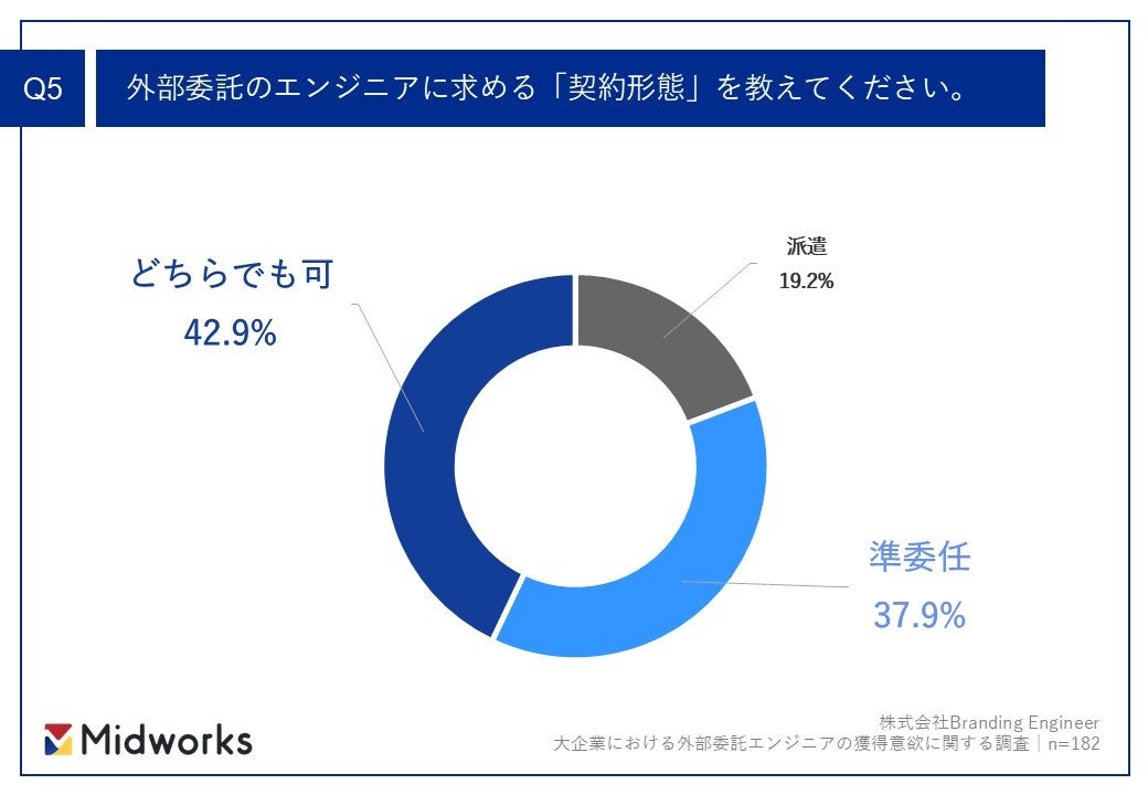 Q1で「かなり意欲が高い」「やや意欲が高い」と回答した方に、「Q5.外部委託のエンジニアに求める「契約形態」を教えてください。」(n=182)と質問したところ、「派遣」が19.2%、「準委任」が37.9%、「どちらでも可」が42.9%という回答となりました。