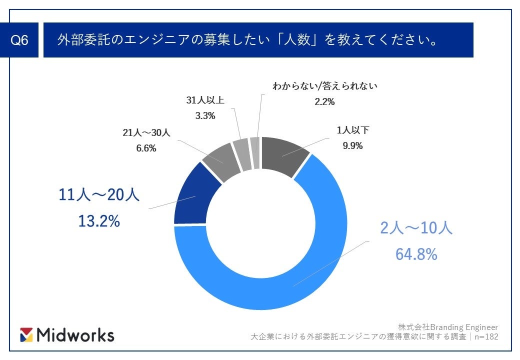 Q1で「かなり意欲が高い」「やや意欲が高い」と回答した方に、「Q6.外部委託のエンジニアの募集したい「人数」を教えてください。」(n=182)と質問したところ、「2人~10人」が64.8%、「11人~20人」が13.2%という回答となりました。