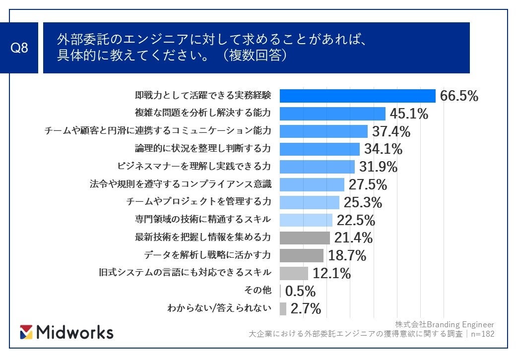 Q1で「かなり意欲が高い」「やや意欲が高い」と回答した方に、「Q8.外部委託のエンジニアに対して求めることがあれば、具体的に教えてください。(複数回答)」(n=182)と質問したところ、「即戦力として活躍できる実務経験」が66.5%、「複雑な問題を分析し解決する能力」が45.1%、「チームや顧客と円滑に連携するコミュニケーション能力」が37.4%という回答となりました。