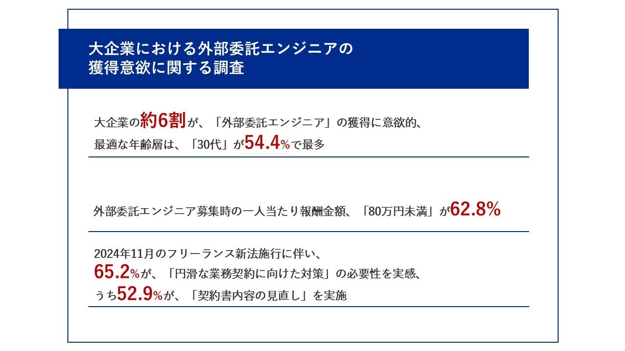 【大企業編|フリーランス新法施行から1ヶ月、影響調査】約6割が、外部委託エンジニアの獲得に意欲的 65.2%が、「円滑な業務契約に向けた対策」の必要性を実感
