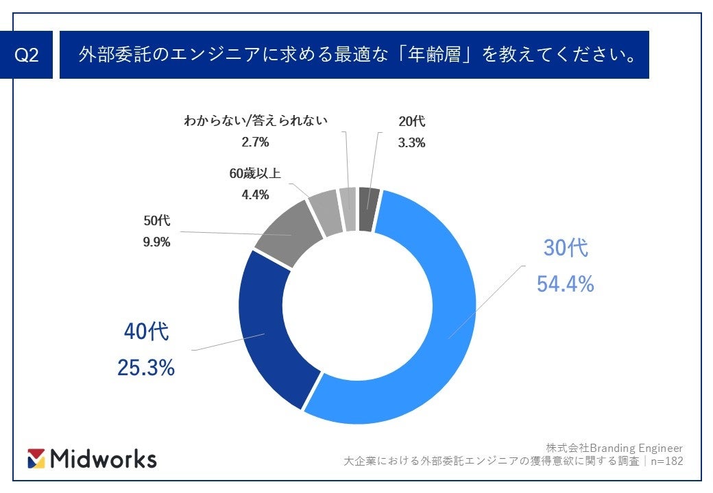 Q1で「かなり意欲が高い」「やや意欲が高い」と回答した方に、「Q2.外部委託のエンジニアに求める最適な「年齢層」を教えてください。」(n=182)と質問したところ、「30代」が54.4%、「40代」が25.3%という回答となりました。
