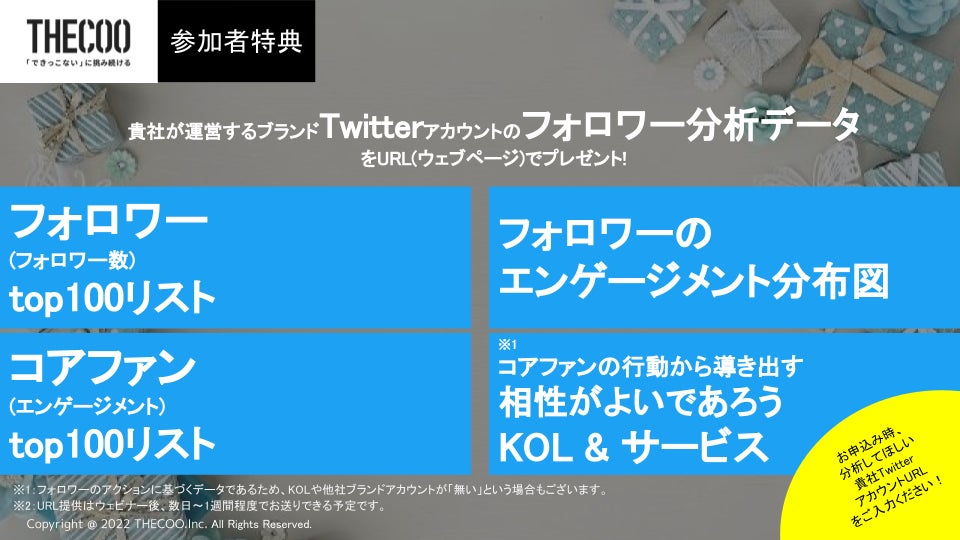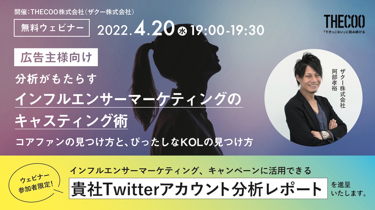 THECOO株式会社(本社:東京都渋谷区、代表取締役CEO:平良真人、証券コード:4255)は、2022年4月20日(水)企業のマーケティング担当者へ向けて「分析がもたらすインフルエンサーマーケティングのキャスティング術」と題した無料セミナーを開催いたします。