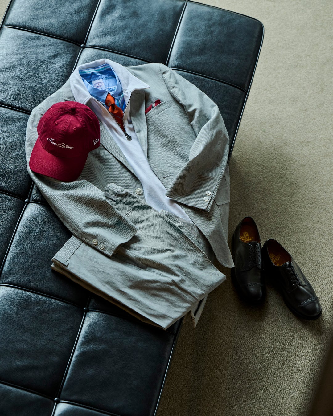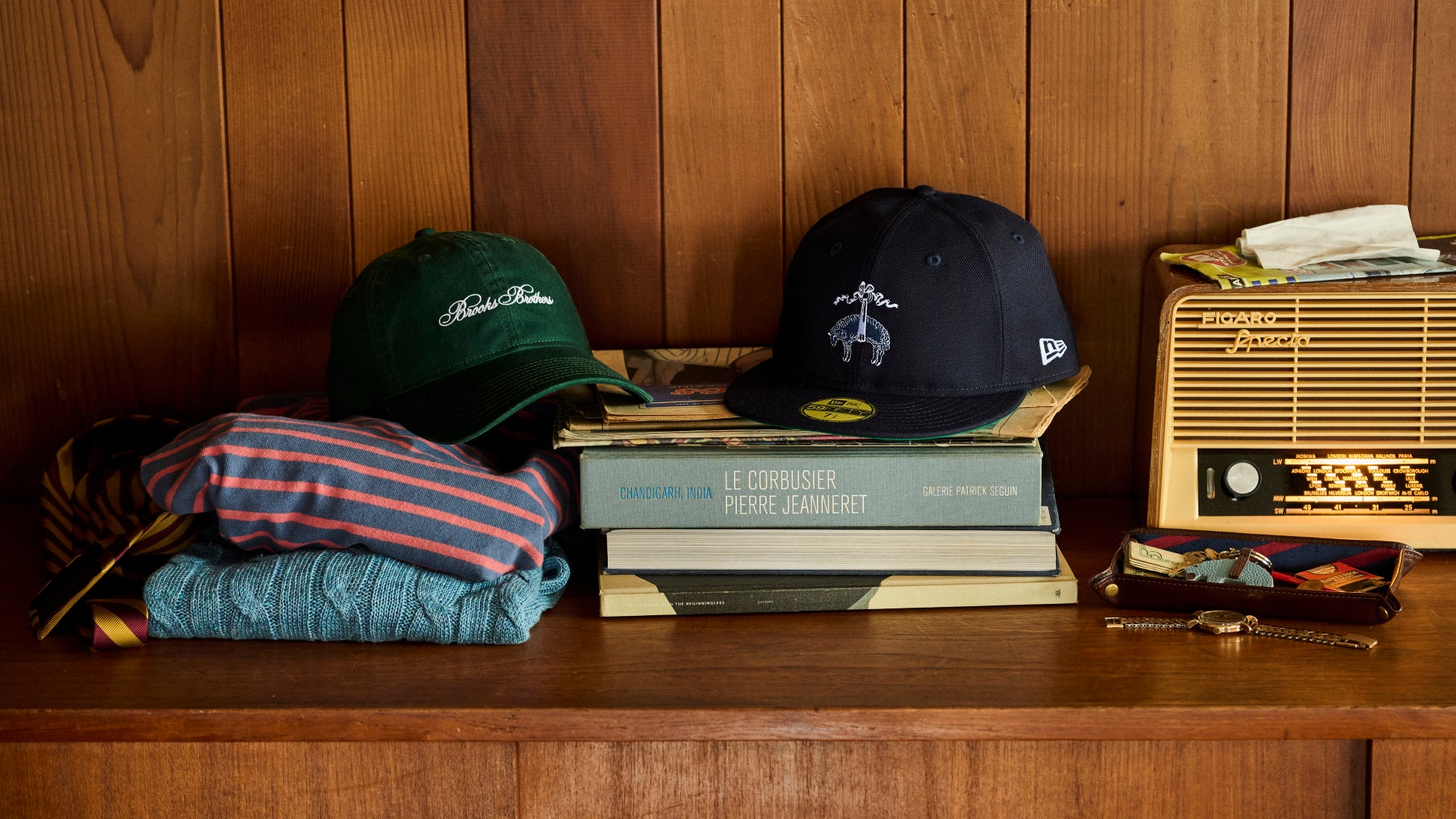 ニューエラ 59FIFTY®をベースにしたコラボキャップを、ブルックス ブラザーズのアイテムとコーディネート