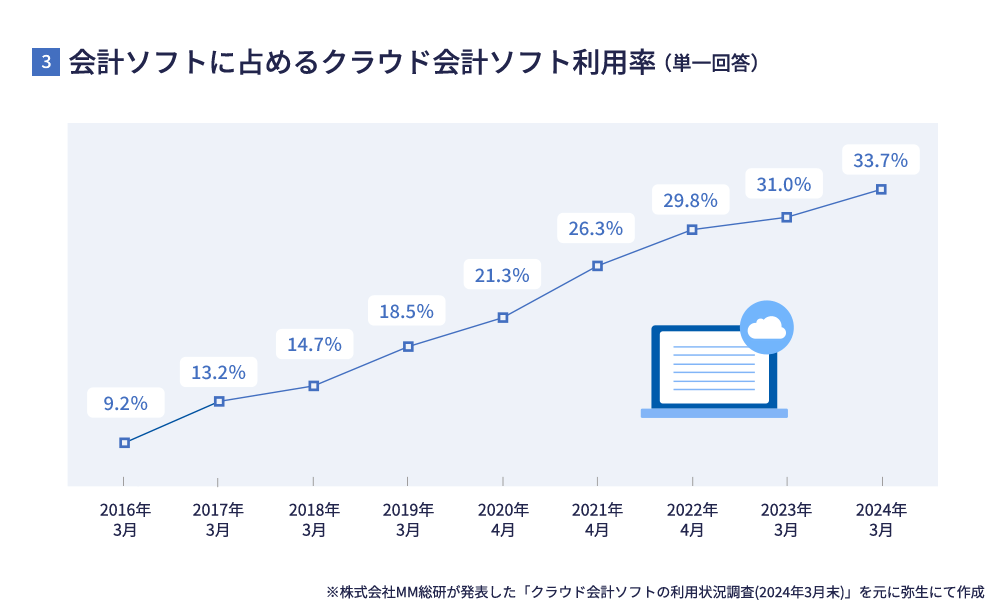 「クラウド会計ソフトの利用状況調査(2024年3月末)」によると、会計ソフト利用者に占めるクラウド利用率は今回の調査において33.7%に拡大し、前年と比較し、2.7ポイント増と拡大基調が強まりました。
