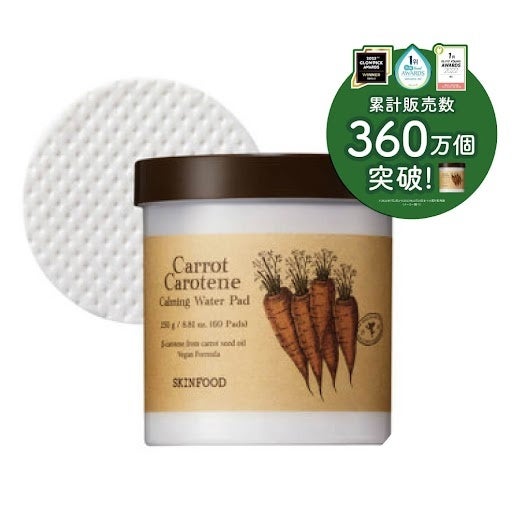 フタを開けてすぐに使える手軽さや、マスクシートのように肌に貼ったり、洗顔代わりにふき取りとして使用できるなどの利便性から、韓国ではマスクシートに代わる定番アイテムになっているトナーパッド。その中でも、『スキンフード キャロットカロテン カーミングウォーターパッド』(https://www.skinfood.co.jp/fs/skin/72802)は特に高い人気を博しており、発売以来全世界で累計360万個(※1)を突破しております。