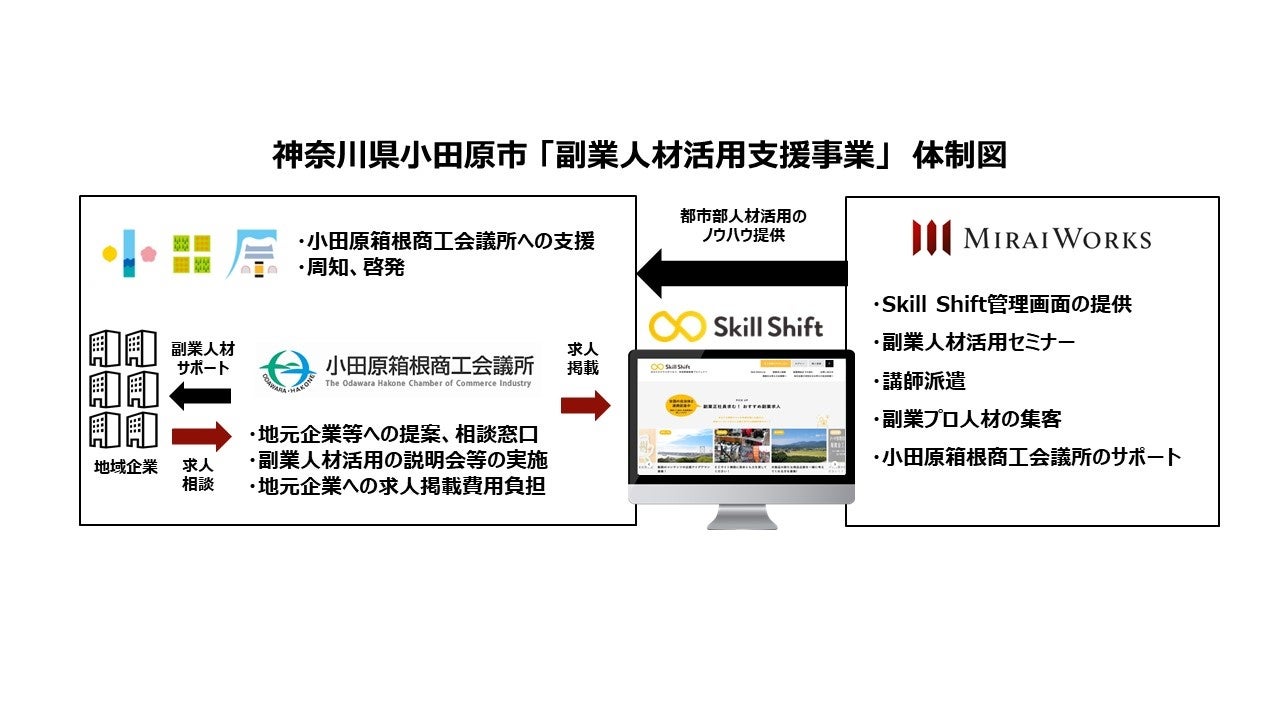 小田原箱根商工会議所が、経営課題を抱える企業に、『副業プロ人材の活用』をご紹介し、企業は経営課題を解決するための求人情報を『Skill Shift』に掲載します。小田原市は、小田原箱根商工会議所が取り組む事業を費用含めて支援し、周知、啓発をいたします。当社は、『Skill Shift』管理画面の提供、副業人材活用セミナーの開催、副業プロ人材の集客、副業プロ人材活性化のサポートを実施し、今後、本仕組みの定着・自走化を進めていくための足掛かりとして、プロジェクトをサポートいたします。